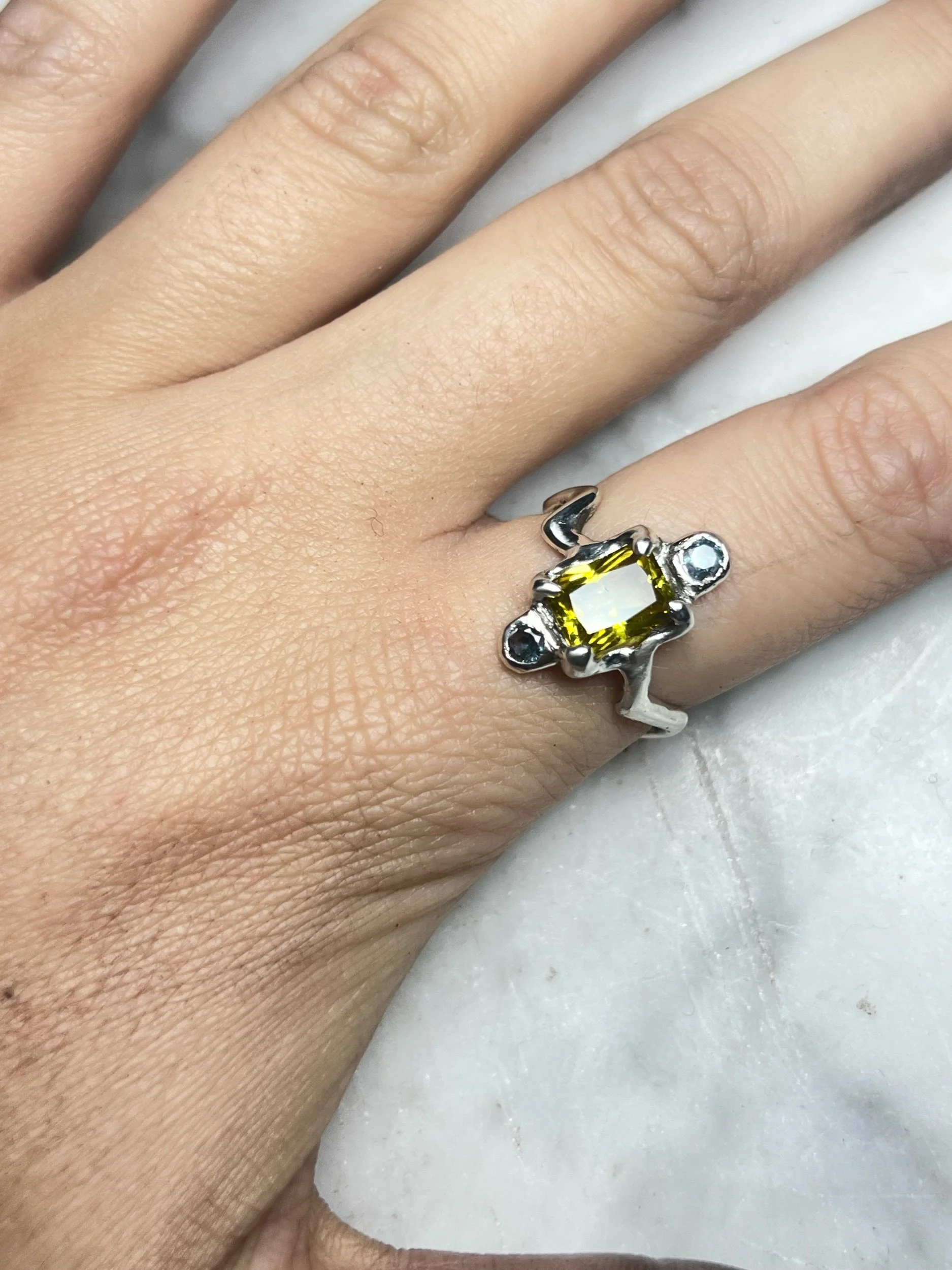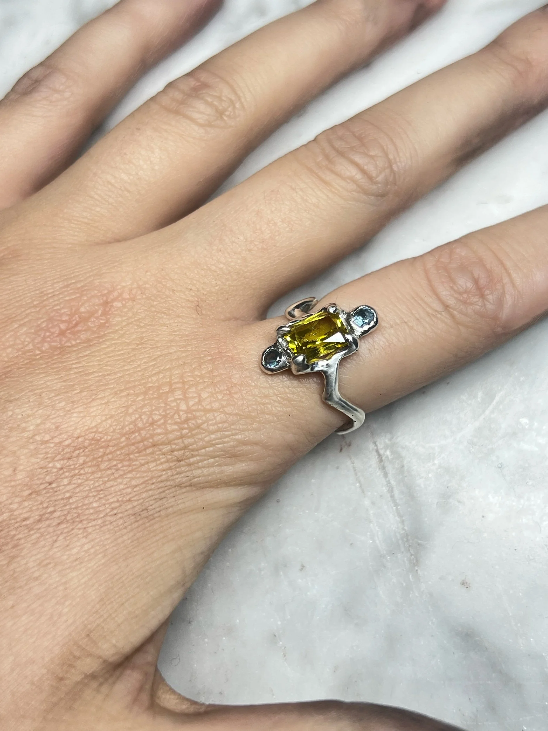Image 1 of 2 Image 2 of 2 dolly $359.00 Crafted in 925 sterling silver, this unique ring features a warm yellow sapphire flanked by two cool aquamarines. Add To Cart Added! Crafted in 925 sterling silver, this unique ring features a warm yellow sapphire flanked by two cool aquamarines.